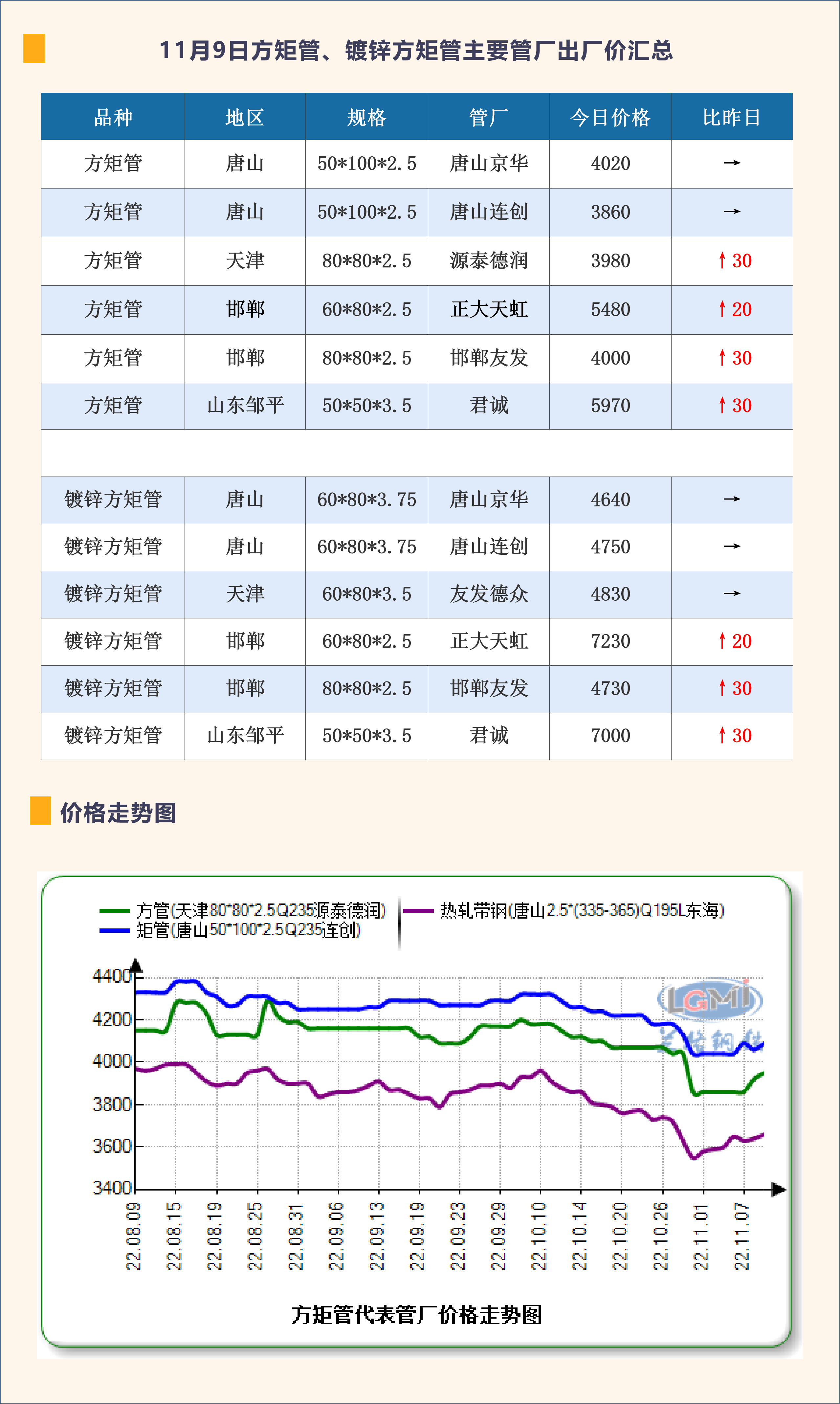 11月9日方矩管、镀锌方矩管主要管厂出厂价汇总