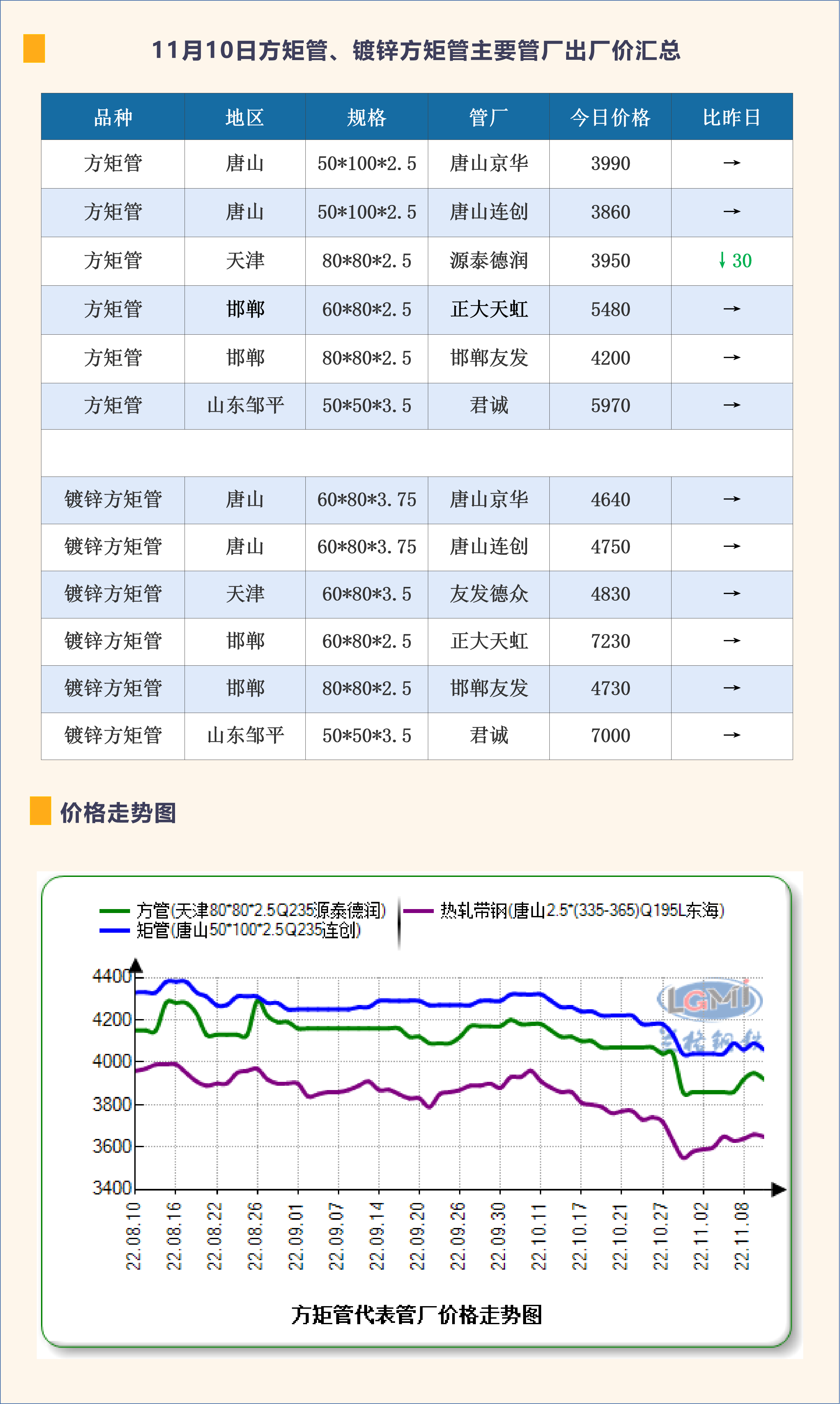 11月10日方矩管、镀锌方矩管主要管厂出厂价汇