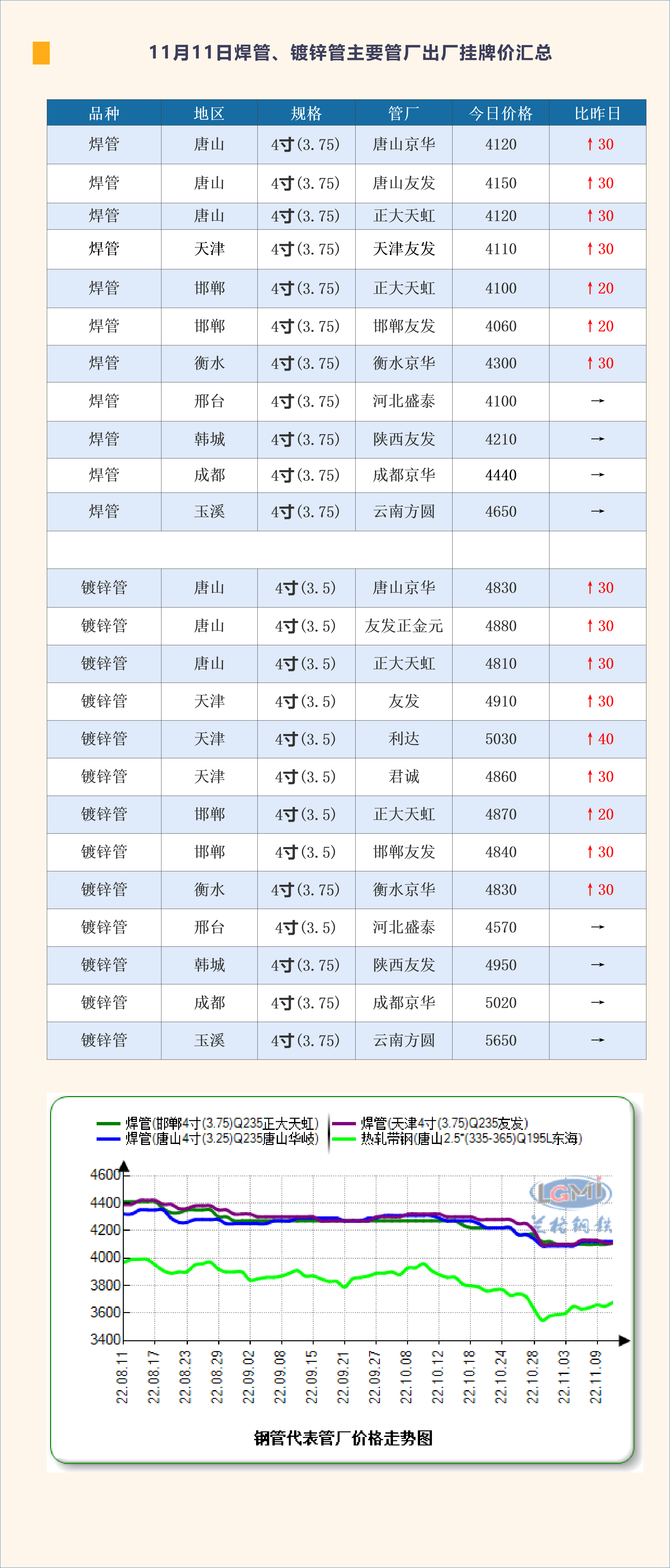 11月11日焊管、镀锌管主要管厂出厂挂牌价汇总