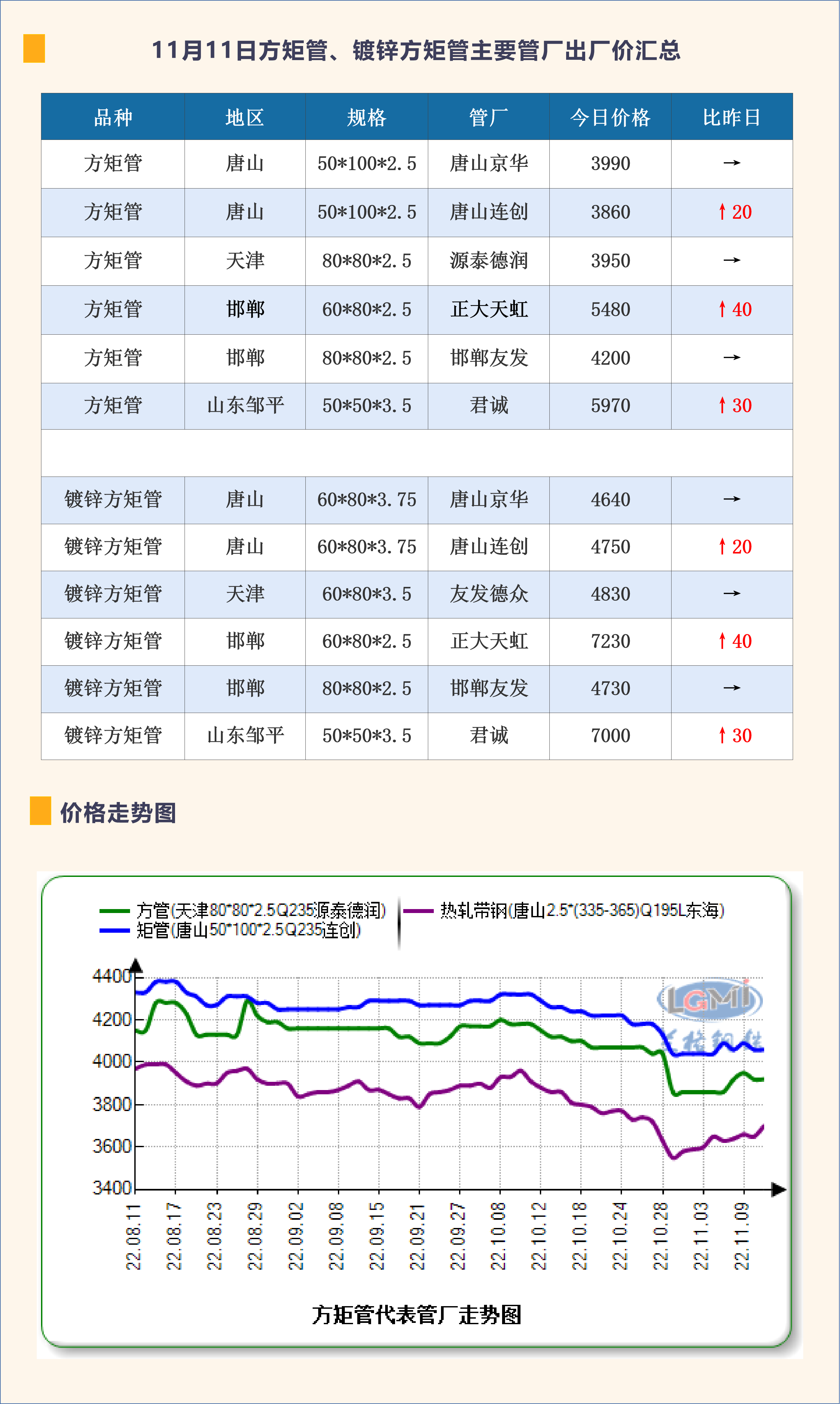 11月9日方矩管、镀锌方矩管主要管厂出厂价汇总
