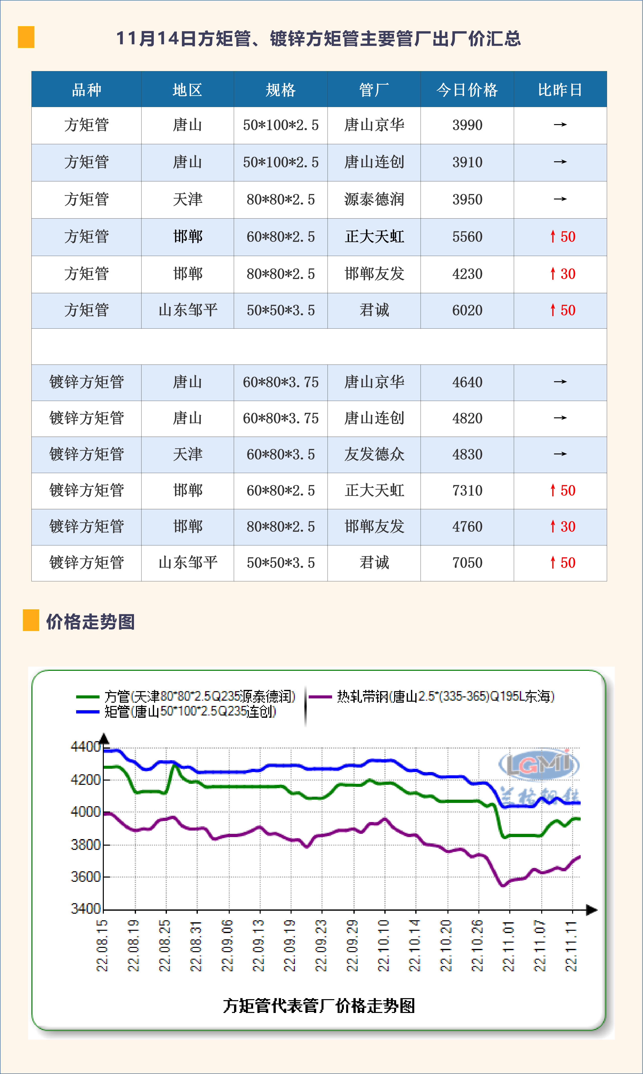 11月14日方矩管、镀锌方矩管主要管厂出厂价汇总