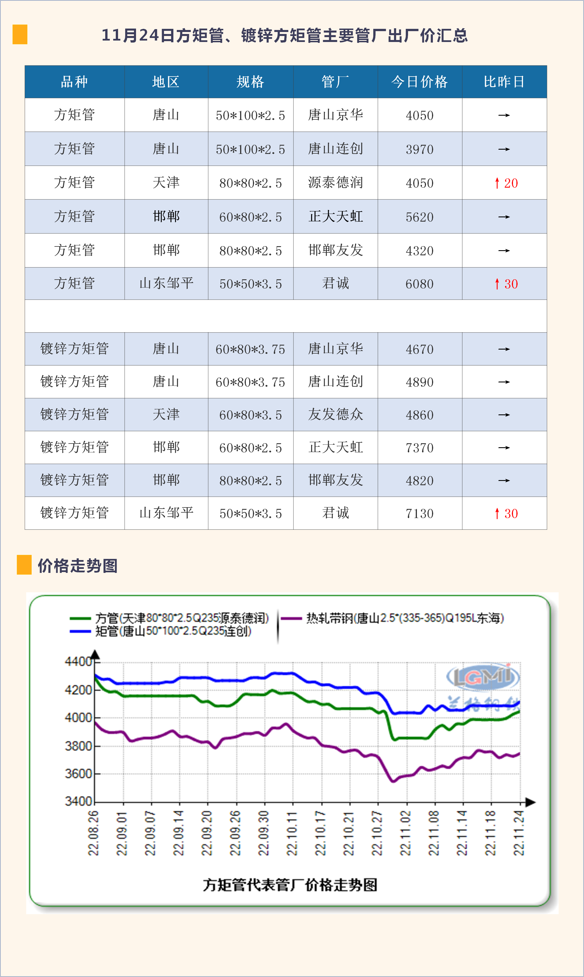 11月22日方矩管、镀锌方矩管主要管厂出厂价汇总