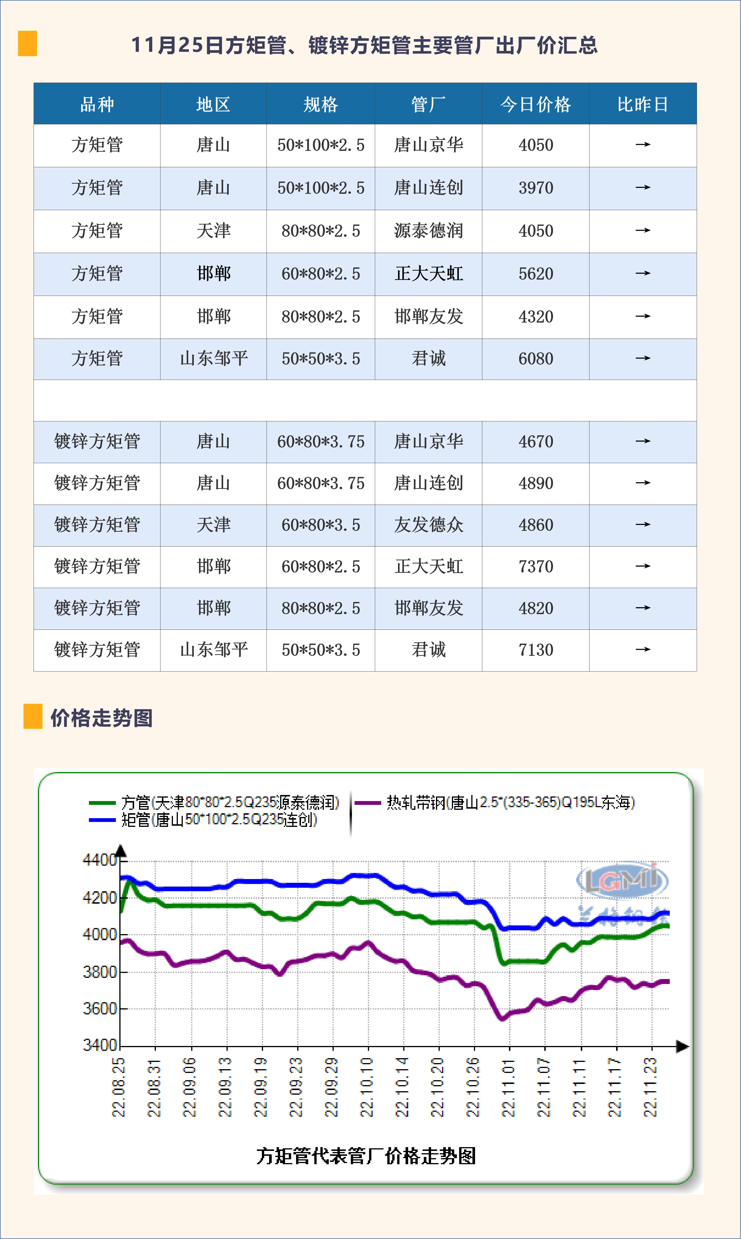 11月25日方矩管、镀锌方矩管主要管厂出厂价汇总