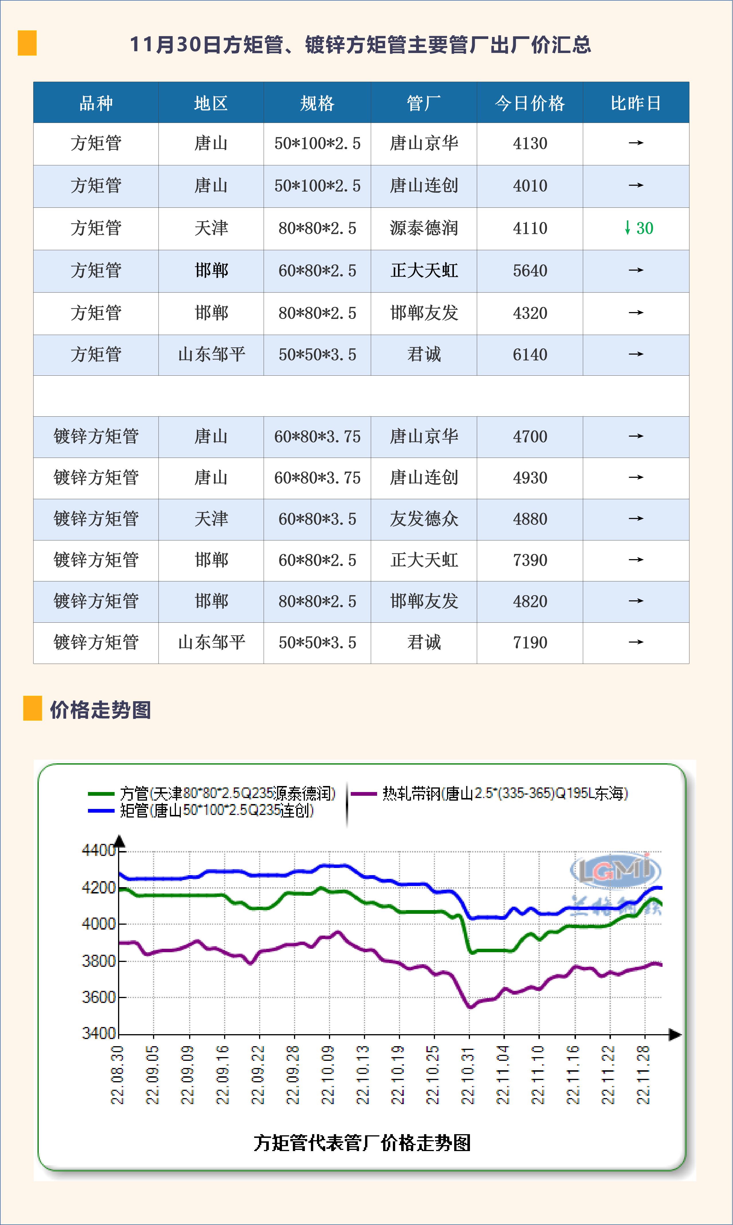 11月29日方矩管、镀锌方矩管主要管厂出厂价汇总