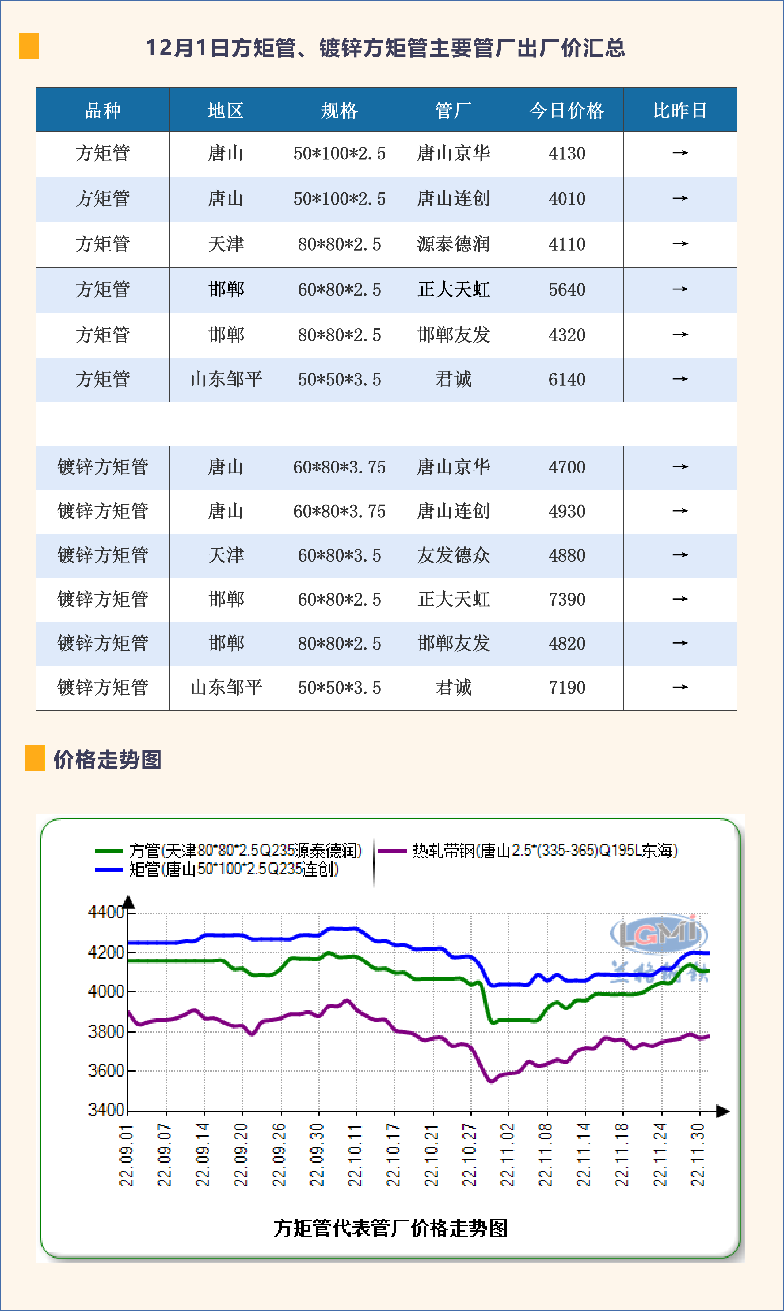 12月1日方矩管、镀锌方矩管主要管厂出厂价汇总