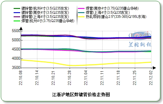 11月下旬江浙沪焊管、镀锌管价格谨慎上探,涨幅20-30元。据兰格钢铁云商平台监测数据显示,江浙沪地区焊管4寸*3.75mm主流报价4300-4350元,镀锌管4寸*3.75mm主流报价4930-5150元;区域内南京、杭州、上海差价50元内,部分镀锌管资源与河北市场价差维持300元左右。
