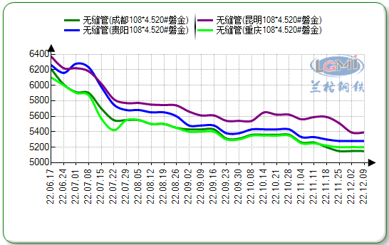 兰格钢铁云商平台监测数据显示:截至12月9日,凤钢无缝管42*4报价5150元,磐金无缝管108*4.5报价5100元,与上周同期持平。