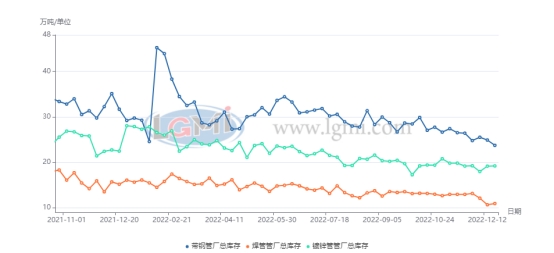 本周,华北地区主流管厂库存继续下降,日均成交较上周继续减弱。本周唐山疫情好转,但天津、邯郸等地迎来疫情高发期,生产、销售及运输均受到较大影响,据了解,本周总体开工率较上周小幅抬升,唐山地区陆续上升至70%,但邯郸、天津依然偏低,一方面是由于疫情的冲击,另一方面也是因为销售压力增大主动减产。本周,管厂出厂价格明显下调,以唐山为例,现唐山焊管4寸出厂价格4100元左右,镀锌管4寸出厂4880元左右,比上周同期下调50-90元。进入12月下旬,由于价格处于高位,且下游冬储意愿较差,厂商表示目前暂以带钢协议为主。华北地区主流管厂最新统计:截止12月22日,华北主流管厂本周总库存53.84万吨,比上周同期降0.84万吨,比上月同期降4.65万吨,比去年同期降15.43万吨,为统计数据以来新低。其中:带钢库存23.72万吨,比上周同期降1.17吨,比上月同期降2.68万吨,比去年同期降7.94万吨;焊管库存10.93万吨,比上周同期增0.28万吨,比上月同期降2万吨,比去年同期降4.23万吨;镀锌管库存19.19万吨,比上周同期增0.05万吨,比上月同期增0.03万吨,比去年同期降3.26万吨;日均成交量2.33万吨,比上周同期减0.33万吨,比上月同期减0.92万吨,比去年同期减1.03万吨。