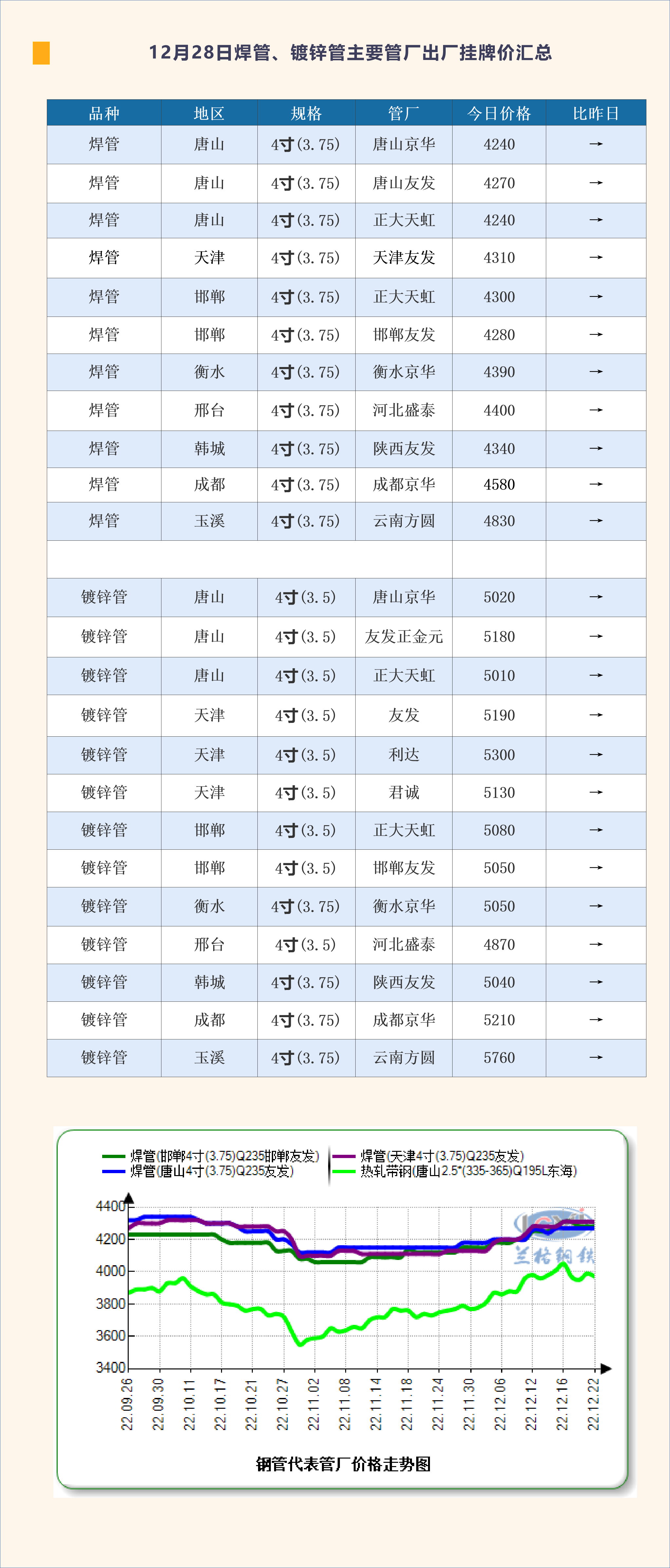12月28日焊管、镀锌管主要管厂出厂挂牌价汇总