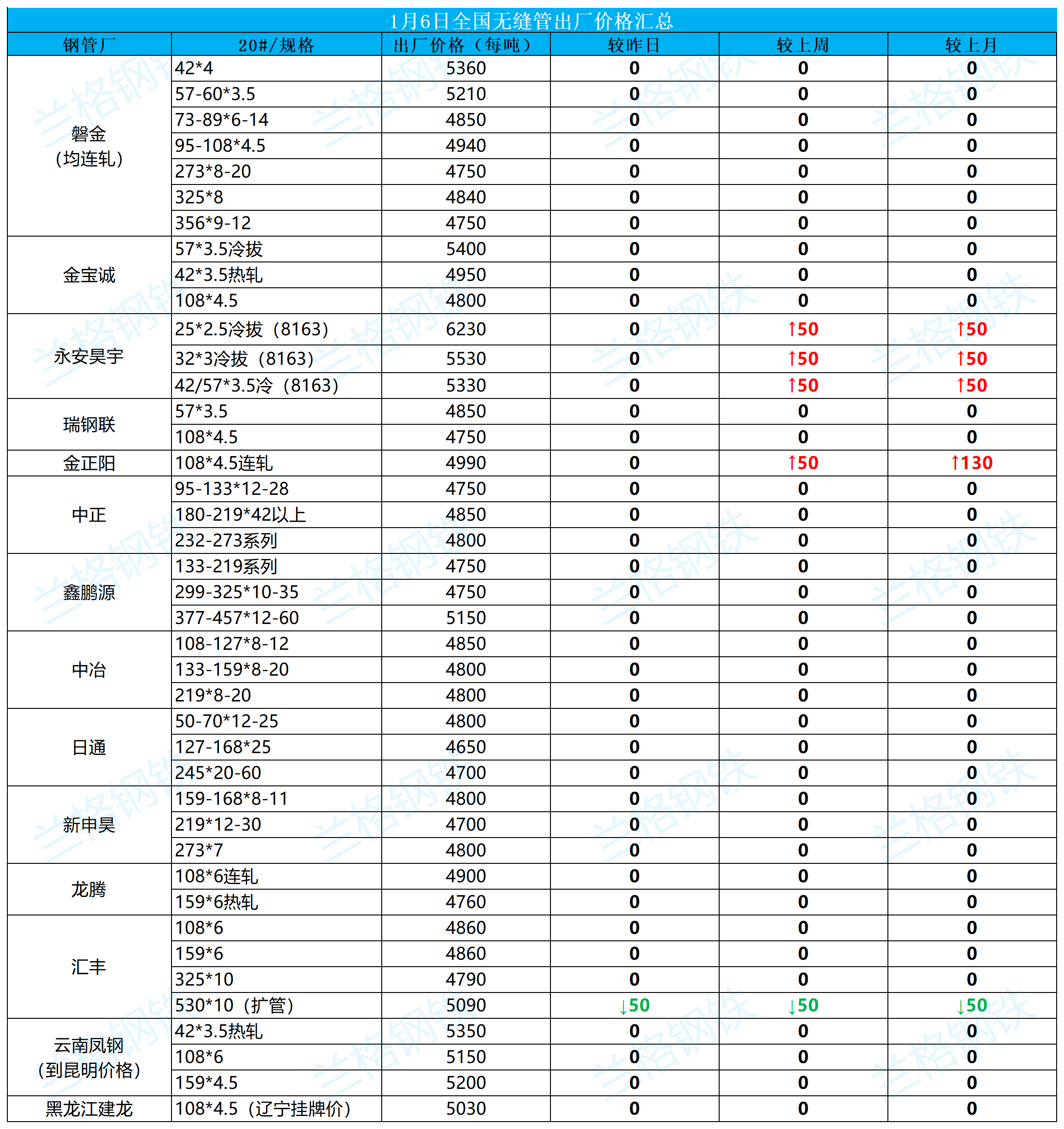 1月6日全国无缝管出厂价格汇总