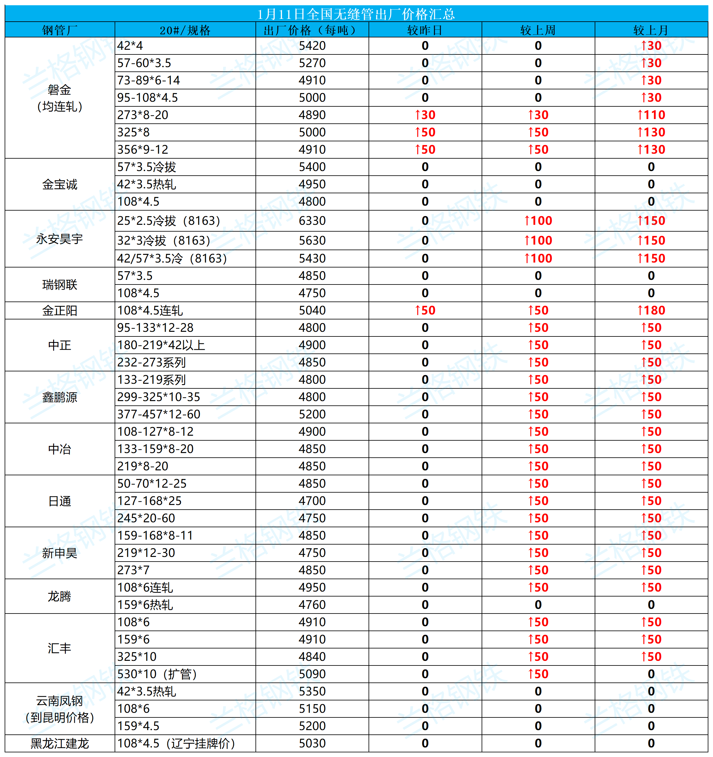 1月11日全国无缝管出厂价格汇总