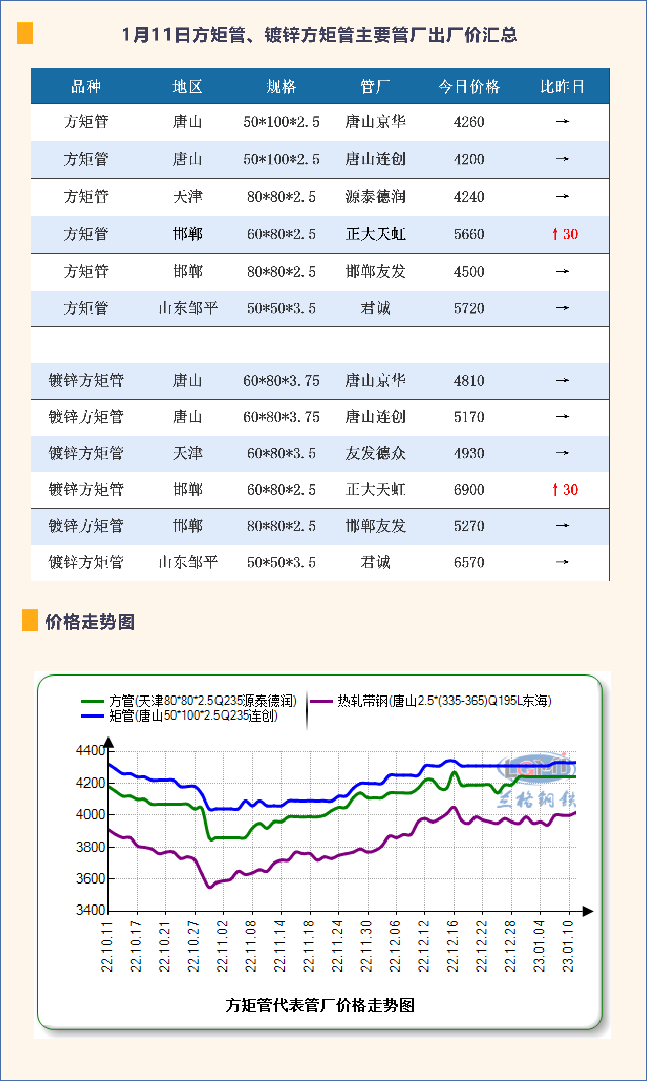 1月11日方矩管、镀锌方矩管主要管厂出厂价汇总