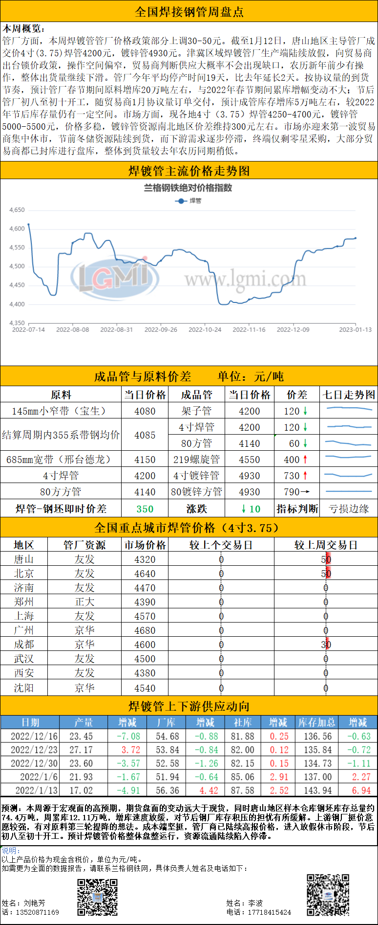 - 国内重点城市焊管、镀锌管库存汇总(01.13)2023/1/13