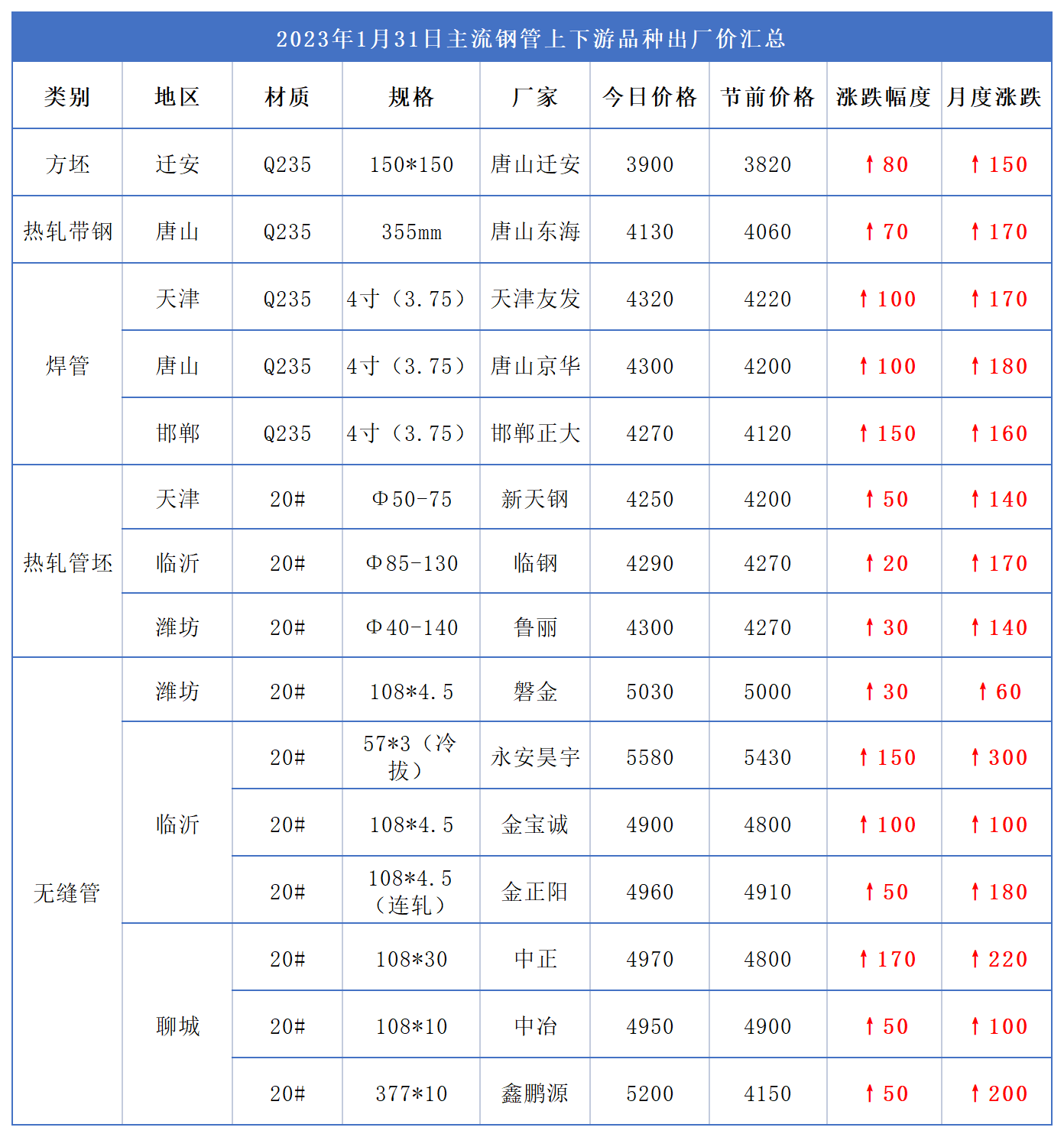 1月31日春节后主流钢管上下游品种出厂价格走势