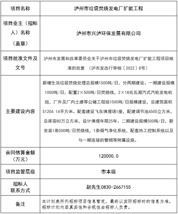 12亿预算!泸州市垃圾焚烧发电厂扩能工程建设项目招标计划