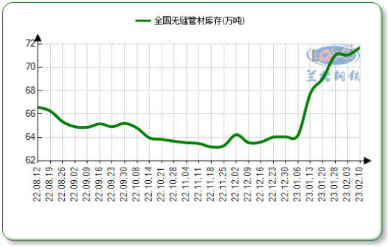 据兰格钢铁云商数据平台监测显示:截至2023年2月10日国内二十三个城市无缝管社会库存总量71.68万吨,周环比上升0.9%,月同比上升5.76%。