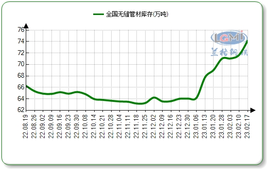 据兰格钢铁云商数据平台监测显示:截至2023年2月17日国内二十三个城市无缝管社会库存总量74.17万吨,周环比上升3.47%,月同比上升7.43%。