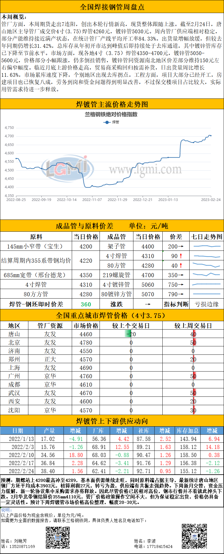 节后第四周国内焊接钢管价格继续盘整趋高。据兰格钢铁云商平台监测数据显示,国内焊管4寸(3.75)过磅含税4621元,较上周交易日涨26元;国内镀锌管4寸(3.75)过磅含税5409元,较上周交易日涨22元。