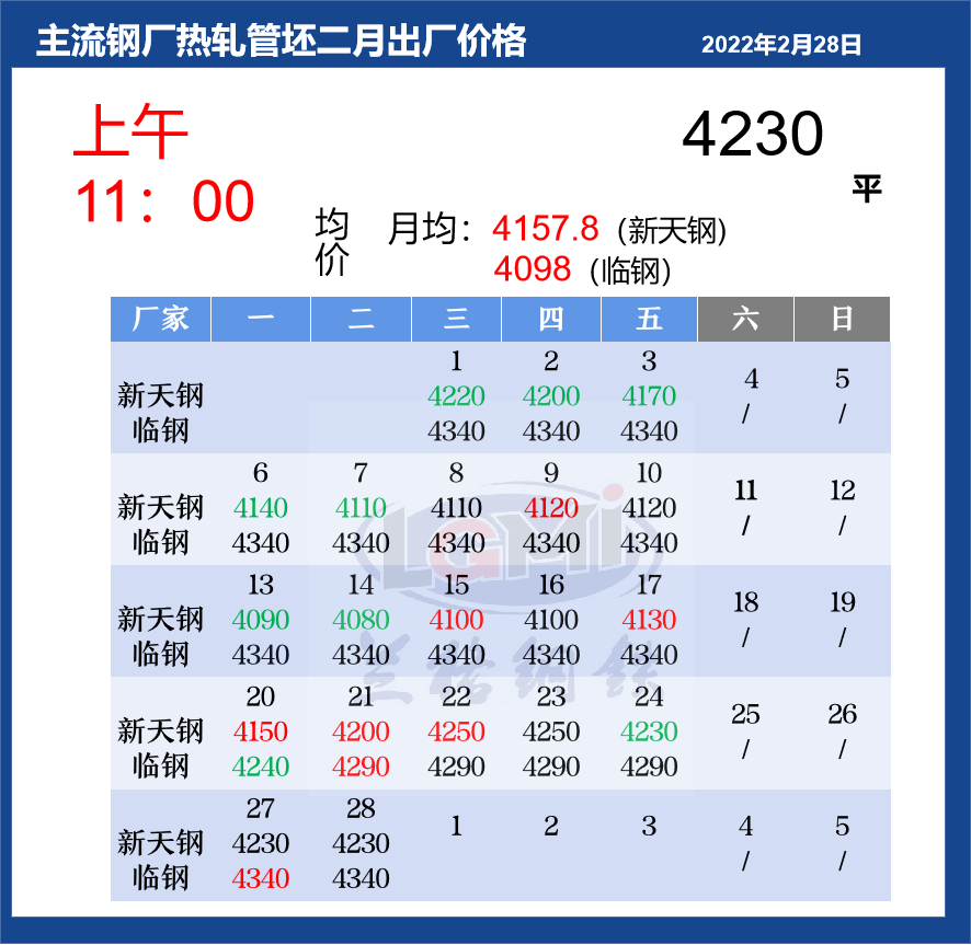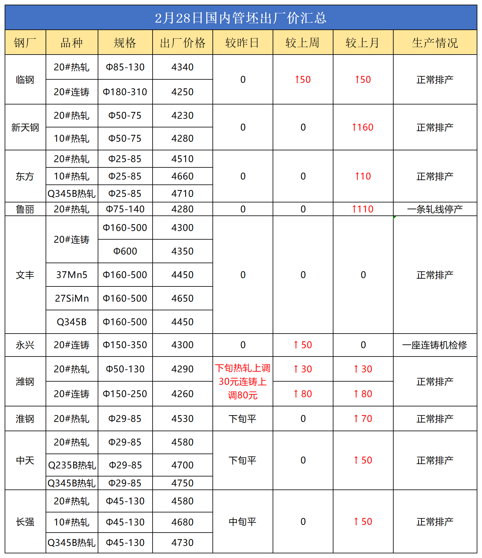 2月28日(11:00)国内管坯出厂价格汇总