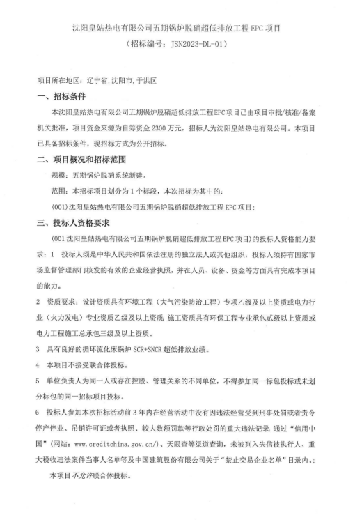 沈阳皇姑热电五期锅炉脱硝超低排放工程EPC项目招标