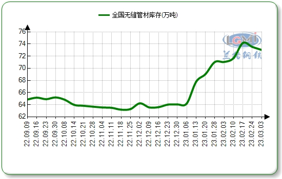 据兰格钢铁网平台监测显示,截至3月3日国内23个城市无缝管社会库存总量73.02万吨,周环比下降0.69%,月同比增长2.78%。市场库存连续两周下降,间接表明下游需求正在复苏。