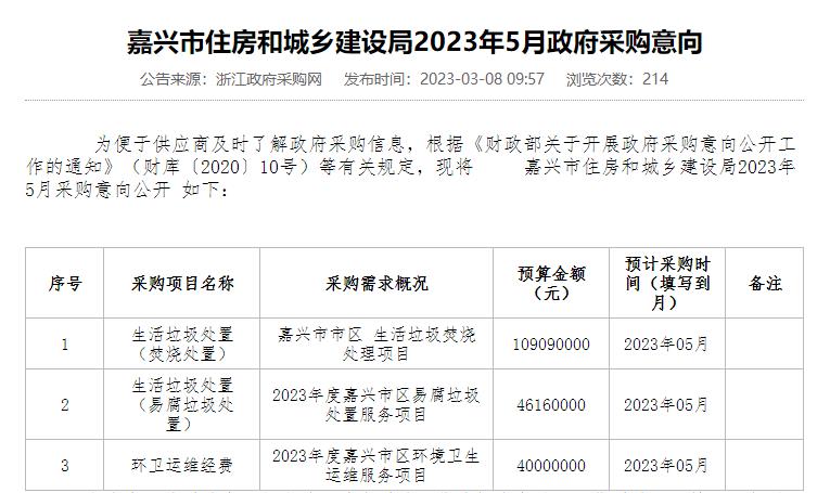 北极星固废网获悉,3月8日,浙江省政府采购网发布嘉兴市住房和城乡建设局2023年5月政府采购意向,预计在5月启动嘉兴市区垃圾处理类三个项目采购,总预算合计19525万元。