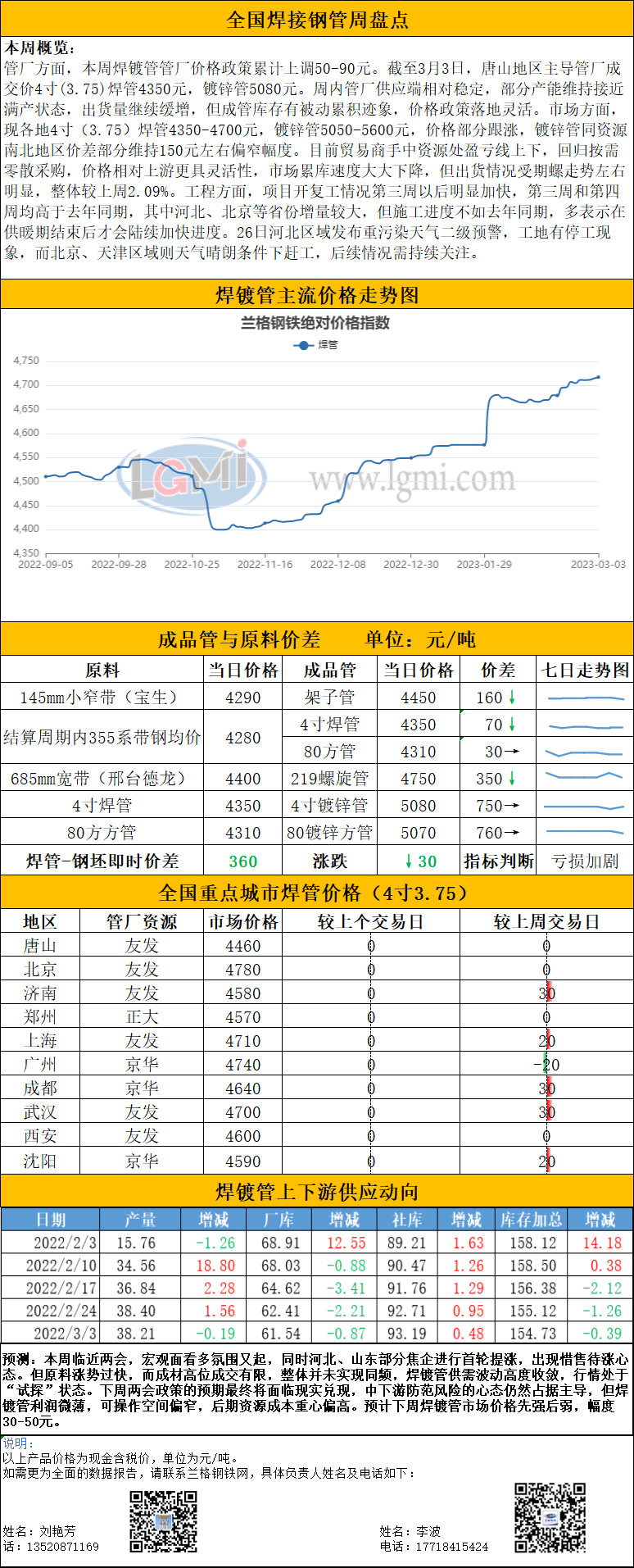 本周国内焊接钢管价格继续盘整趋高。据兰格钢铁云商平台监测数据显示,国内焊管4寸(3.75)过磅含税4634元,较上周交易日涨13元;国内镀锌管4寸(3.75)过磅含税5438元,较上周交易日涨29元。