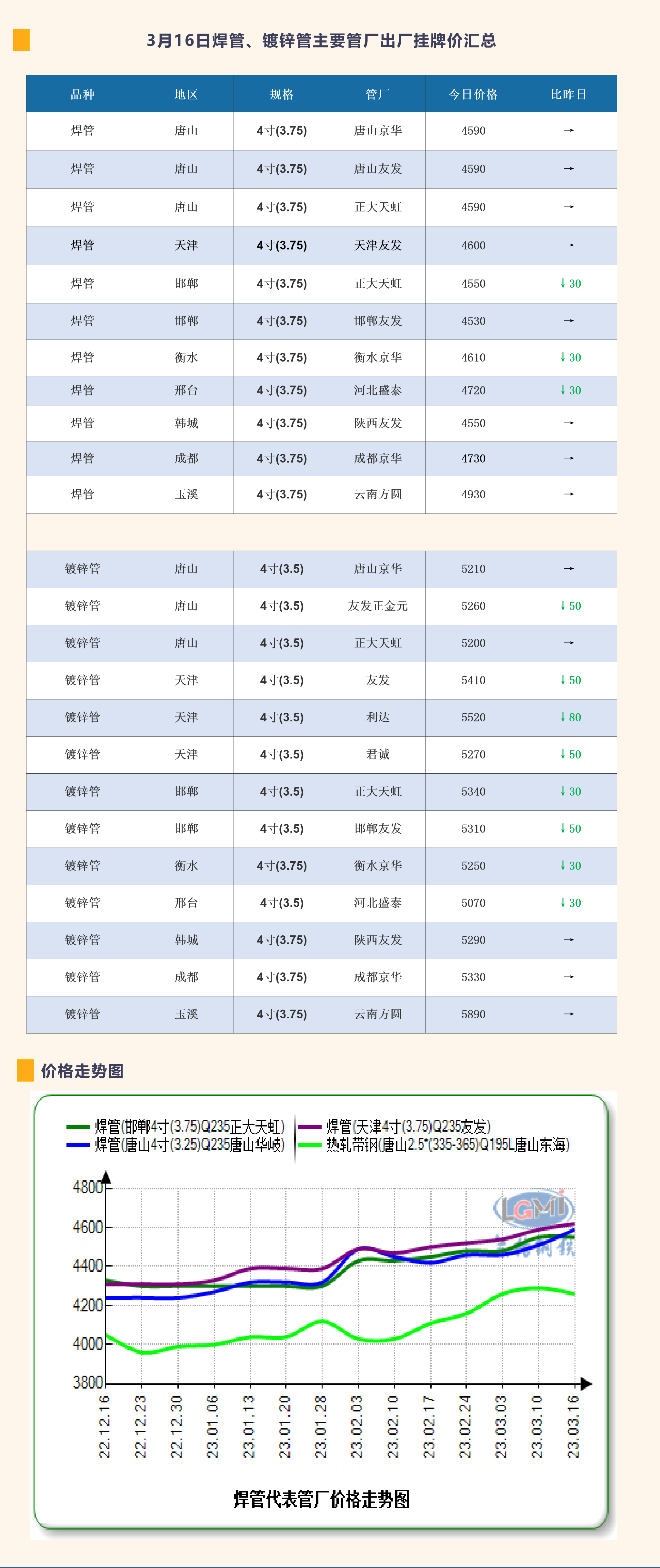 3月16日焊管、镀锌管主要管厂出厂挂牌价汇总