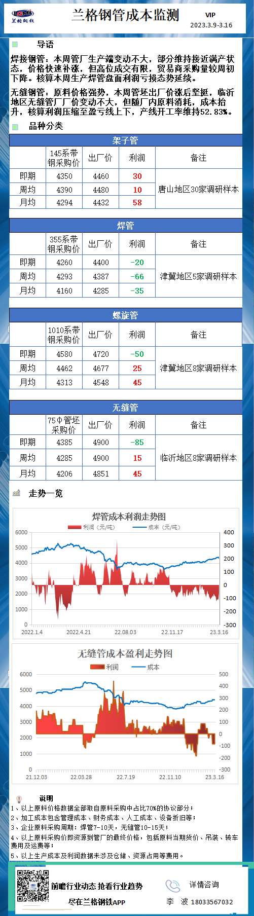 兰格调研:钢管成本利润监测(3月16日)