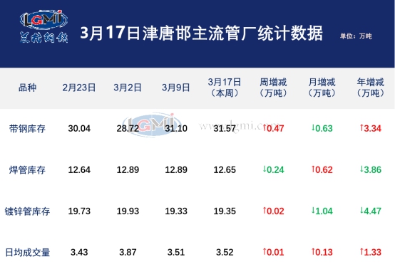 本周(3.17)厂内镀锌管库存19.35万吨,比上周同期增0.02万吨,增长0.1%;比上月同期降1.04万吨,下降5.1%;比去年农历同期降4.47万吨,下降18.77%。
