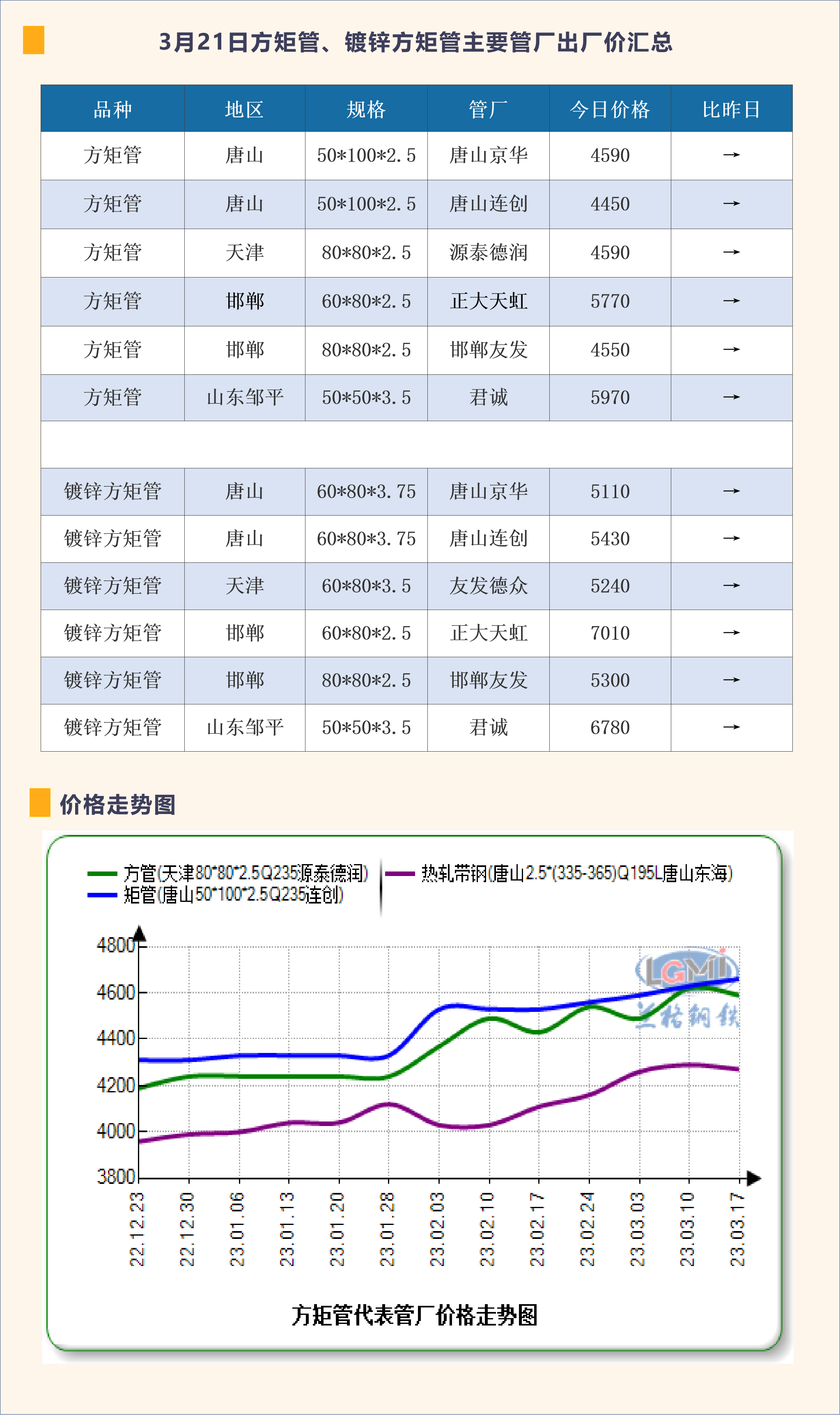 3月21日方矩管、镀锌方矩管主要管厂出厂价汇总