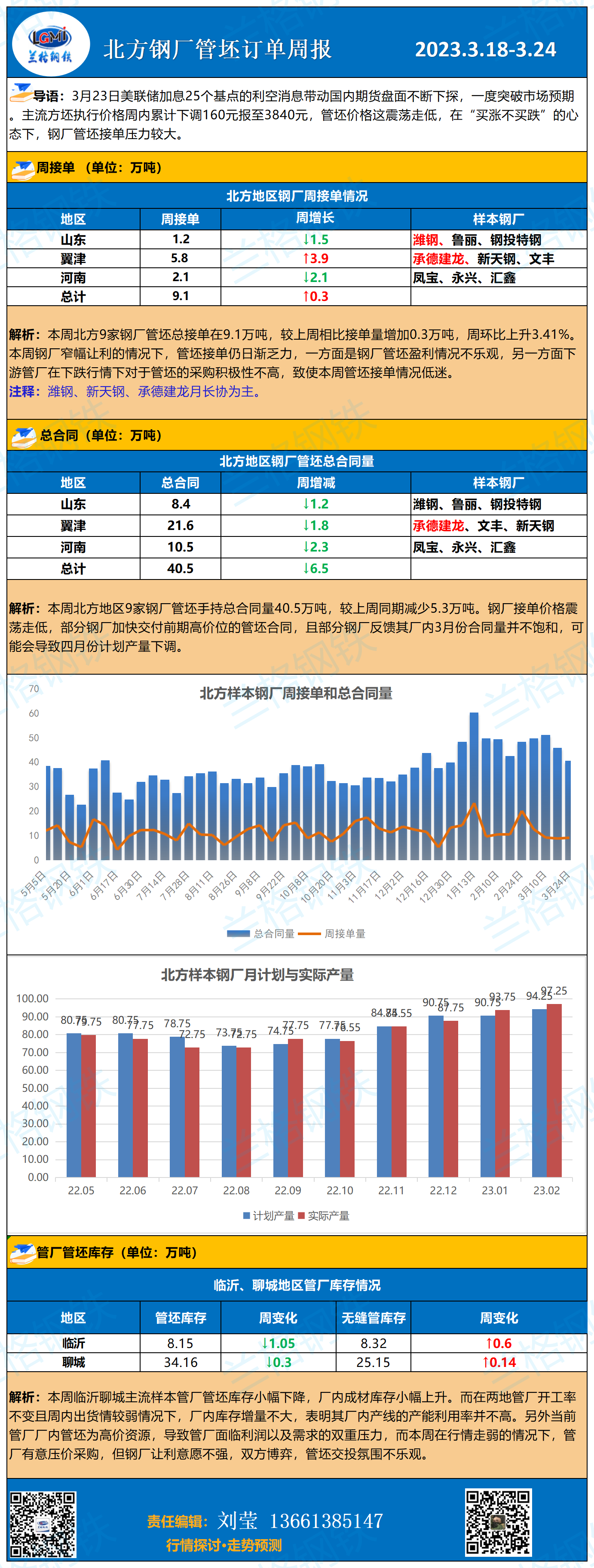 兰格调研:北方钢厂管坯周订单量追踪(3月24日)