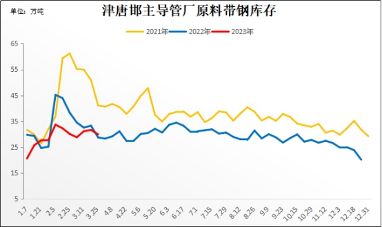 原料带钢 本周(3.30)厂内原料带钢库存27.36万吨,比上周同期降2.5万吨,下降8.37%;比上月同期降1.36万吨,下降4.74%;比去年同期降0.87万吨,下降3.08%。