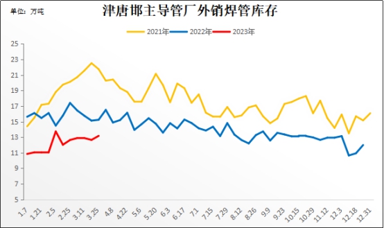 外销焊管 本周(3.30)厂内焊管库存13.11万吨,比上周同期降0.06万吨,下降0.46%;比上月同期增0.22万吨,增长1.71%;比去年同期降3.4万吨,下降20.59%。