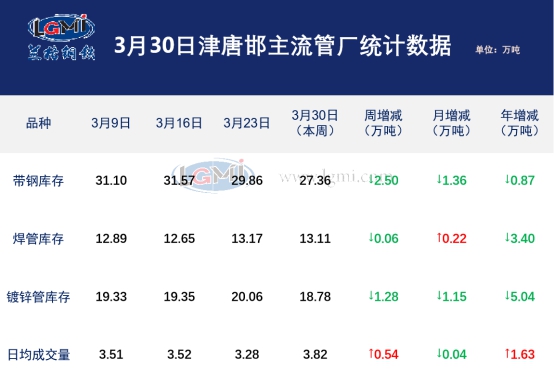 本周(3.30)厂内镀锌管库存18.78万吨,比上周同期降1.28万吨,下降6.38%;比上月同期降1.15万吨,下降8.92%;比去年农历同期降5.04万吨,下降21.16%。