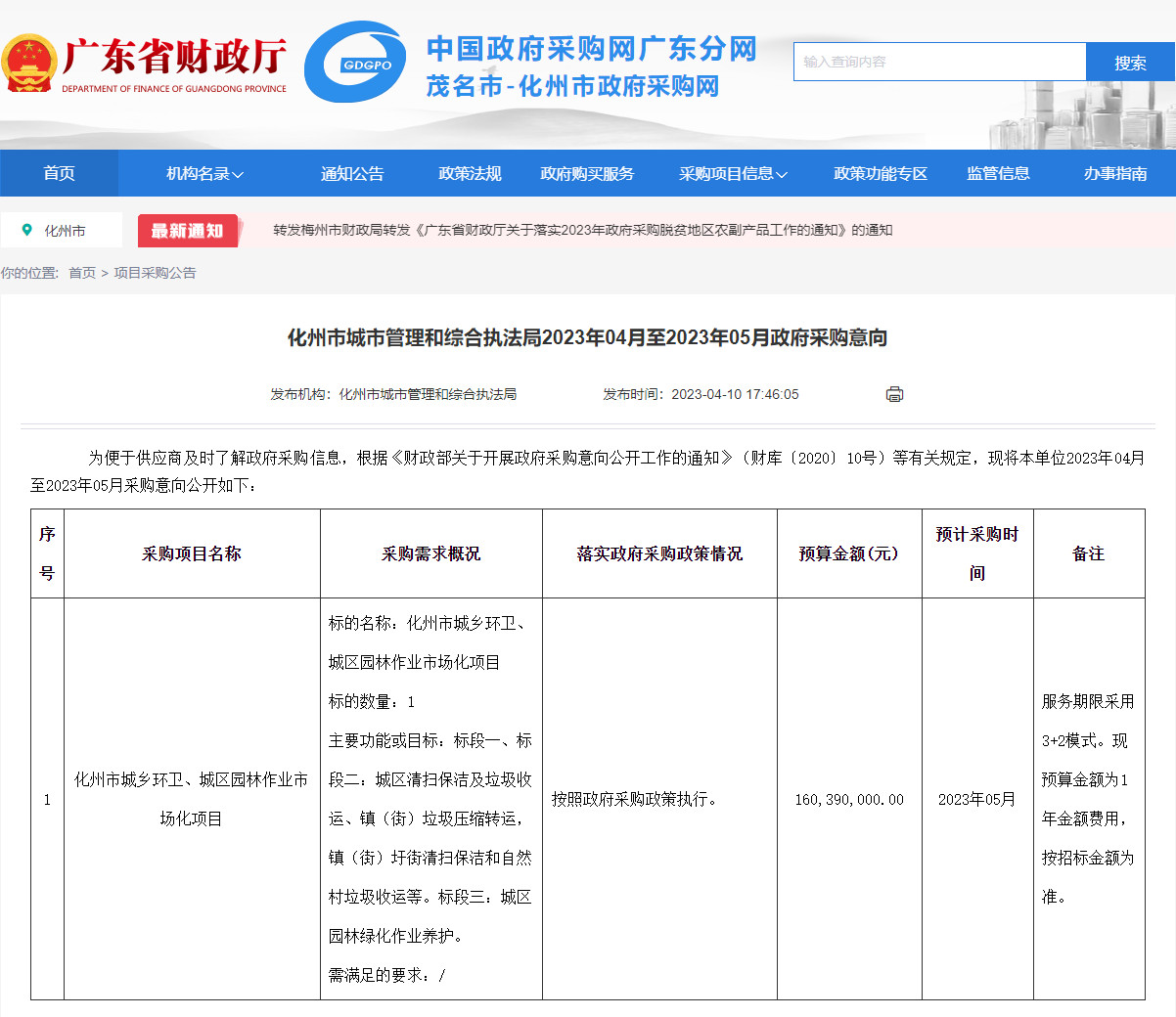 北极星环卫网获悉,4月10日,广东政府采购网发布化州市城市管理和综合执法局2023年04月至2023年05月政府采购意向,预计5月启动化州市城乡环卫、城区园林作业市场化项目采购,采购预算1.6039亿元/年,服务期限采用3+2模式,总预算超8亿元。
