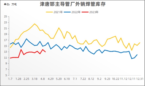 外销焊管 本周(4.21)厂内焊管库存12.48万吨,比上周同期降0.49万吨,下降3.78%;比上月同期降0.69万吨,下降5.24%;比去年同期降3.36万吨,下降20.82%。