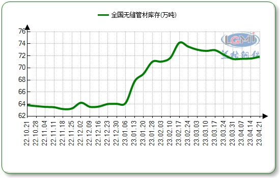 据兰格钢铁网平台监测显示,截至4月14日国内23个城市无缝管社会库存总量71.86万吨,月同比下降0.42%,市场本周出货较上周走弱。