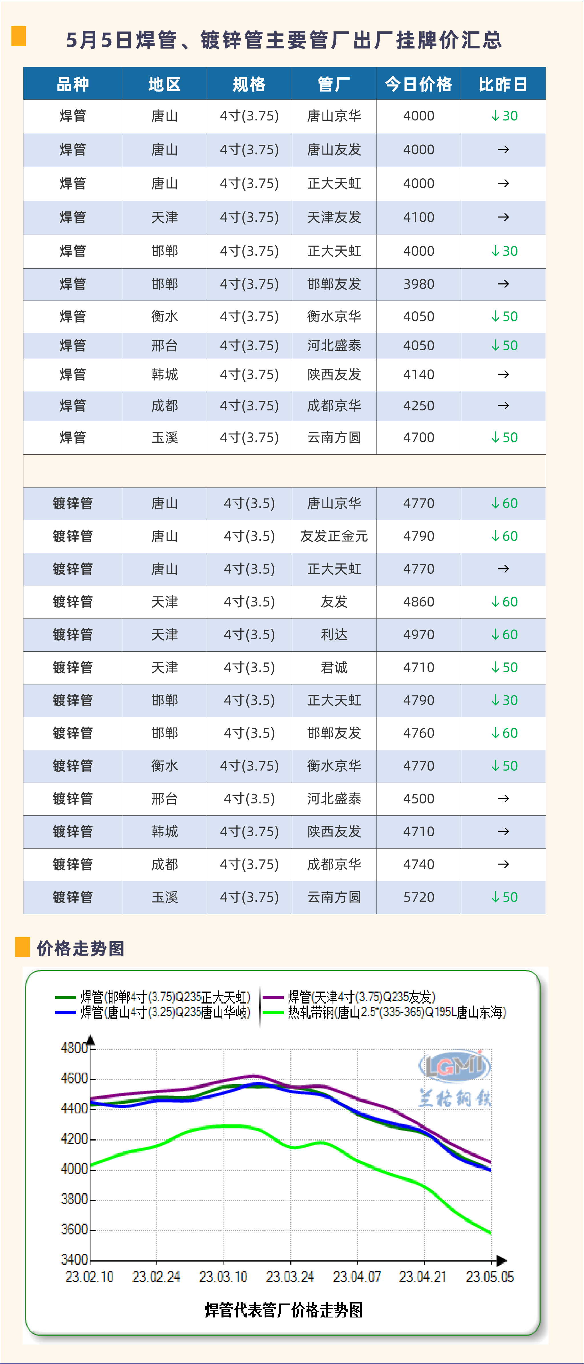 5月5日焊管、镀锌管主要管厂出厂挂牌价汇总
