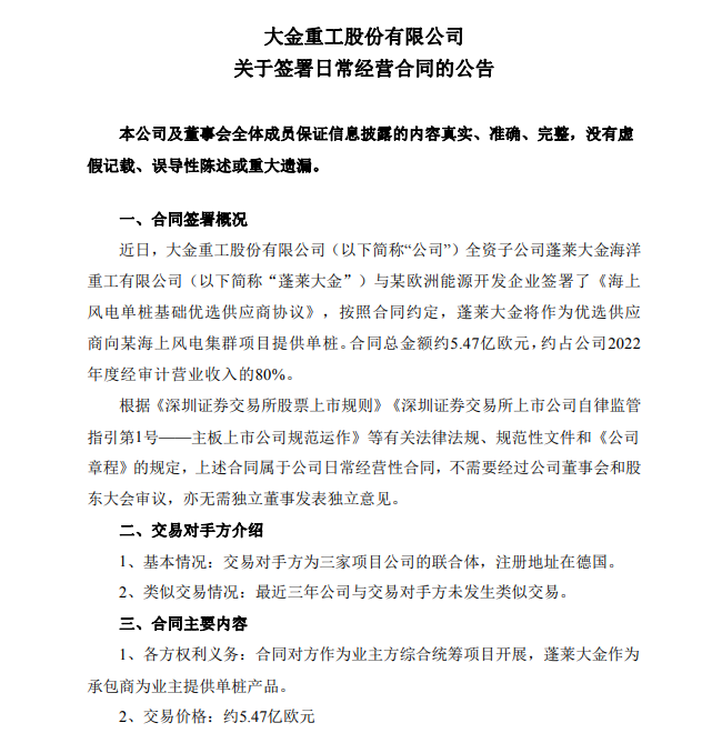 北极星风力发电网讯:近日,大金重工股份有限公司(以下简称“大金重工”)全资子公司蓬莱大金与某欧洲能源开发企业签署了《海上风电单桩基础优选供应商协议》,按照合同约定,蓬莱大金将作为优选供应商向某海上风电集群项目提供单桩。合同总金额约5.47亿欧元(发文时汇率换算,约合42亿元人民币),约占公司2022年度经审计营业收入的80%。