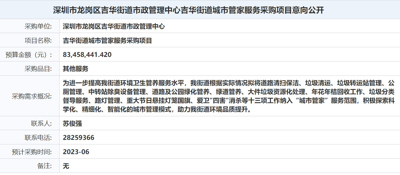 预计6月采购!深圳市龙岗区吉华街道城市管家服务采购项目意向公开!