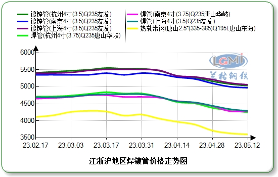 5月上旬江浙沪焊管、镀锌管价格跌后企稳,跌幅50-100元。据兰格钢铁云商平台监测数据显示,江浙沪地区焊管4寸*3.75mm主流报价4000-4100元,镀锌管4寸*3.75mm主流报价4800-5000元。南京、杭州同厂资源镀锌管价格相近,与上海价差50元左右,部分与河北市场价差走扩至300元左右。