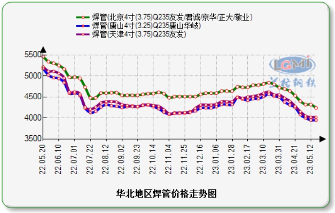 本周(05.15-05.19),华北地区焊管镀锌管价格涨跌互现。兰格钢铁云商平台监测数据显示,截至2023年5月19日,焊管方面,北京地区焊管4寸(3.75mm)价格为4240元比上周同期下跌80元,唐山地区焊管4寸(3.75mm)价格为3950元与上周同期持平,天津地区焊管4寸(3.75mm)价格为3990-4020元与上周同期持平。镀锌管方面,北京地区镀锌管4寸(3.75mm)价格为4960-5230元本周涨跌互现;唐山地区镀锌管4寸(3.75mm)价格为4720-4740元与上周同期持平;天津地区镀锌管4寸(3.75mm)价格为4720-4960元比上周同期上涨10-50元。
