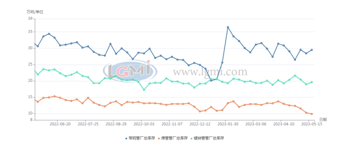 本周,华北地区主流管厂最新统计:截止5月18日,华北主流管厂本周总库存58.91万吨,比上周同期增1.33万吨,比上月同期降2.94万吨,比去年同期降11.92万吨。其中:原料带钢库存29.47万吨,比上周同期增1.07万吨,比上月同期增0.43万吨,比去年同期降2.54万吨;焊管库存9.87万吨,较上周同期降0.38万吨,比上月同期降2.61万吨,比去年同期降4.86万吨;镀锌管库存19.57万吨,比上周同期增0.64万吨,比上月同期降0.76万吨,比去年同期降4.52万吨;日均成交量3.1万吨,比上周减0.07万吨,比上月同期增0.065万吨,比去年同期增0.53万吨。