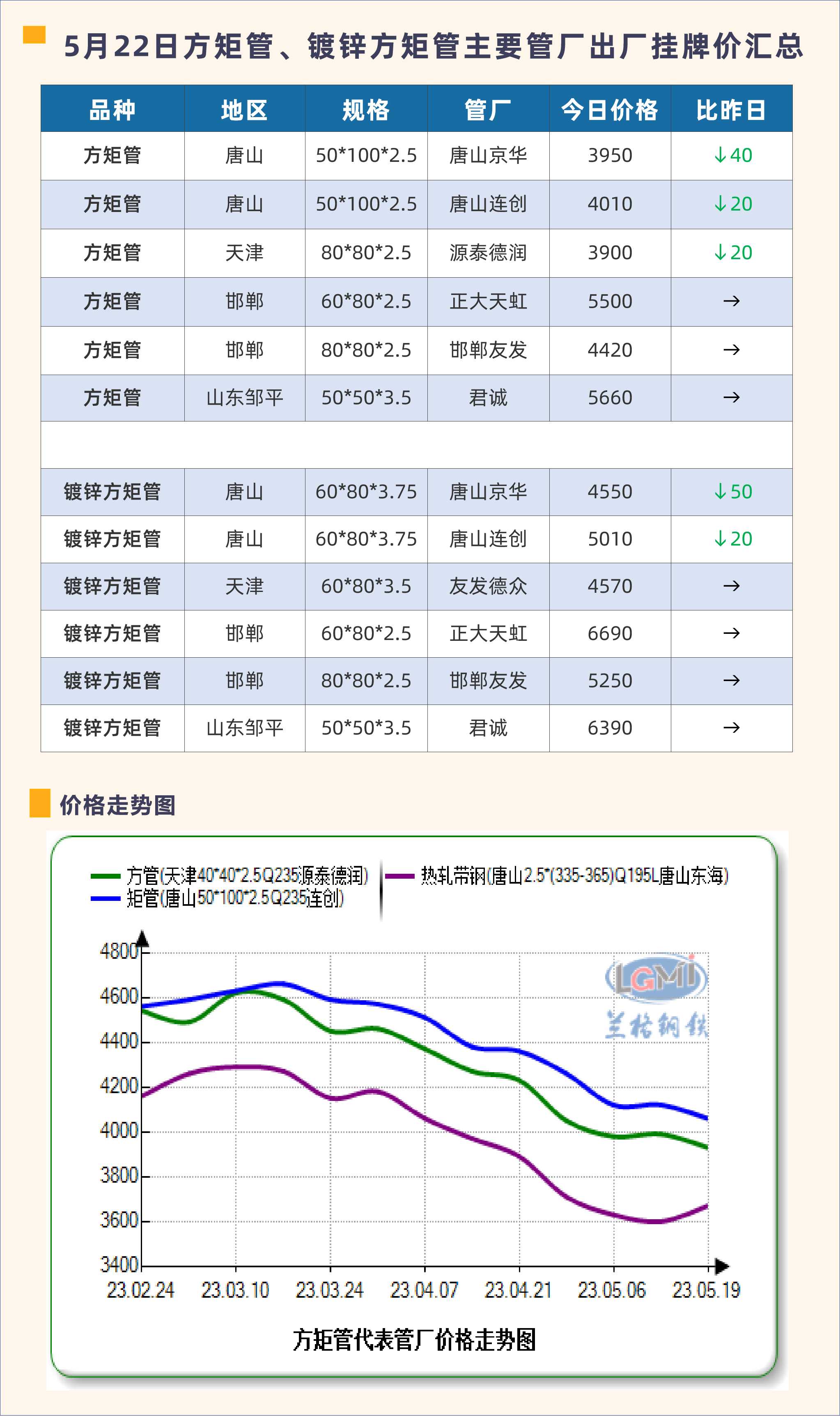 • 5月22日方矩管、镀锌方矩管主要管厂出厂挂牌价汇总