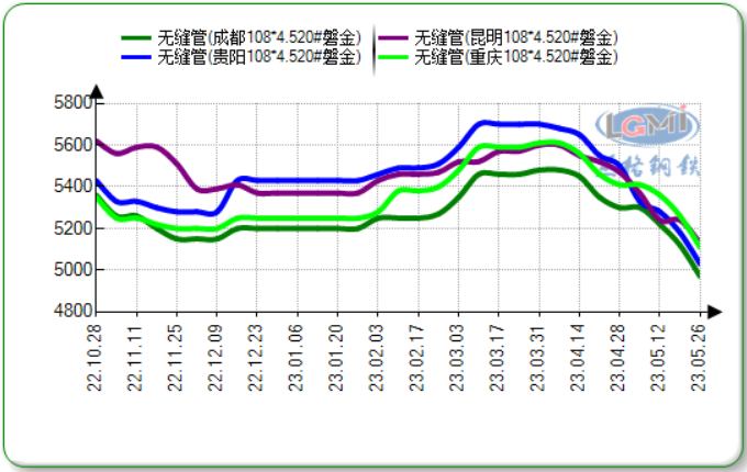 兰格钢铁云商平台监测数据显示:截至5月26日,凤钢无缝管42*4报价5000元,磐金无缝管108*4.5报价4950元,与上周下跌150元。
