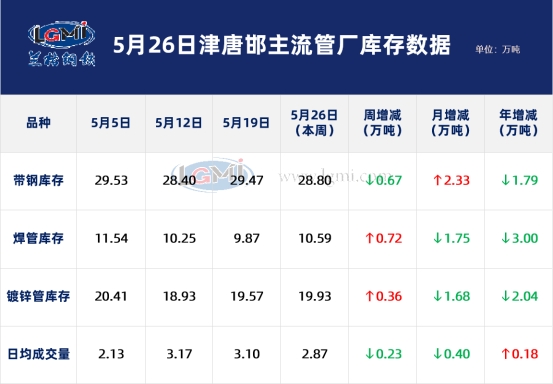 外销镀锌管 本周(5.26)厂内镀锌管库存19.93万吨,比上周同期增0.36万吨,增长1.84%;比上月同期降1.68万吨,下降7.77%;比去年同期降2.04万吨,下降9.29%。