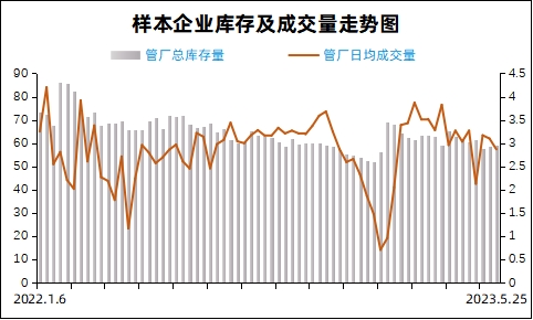 本周主导管厂库存数据变化 本周(5.26)厂内总库存59.32万吨,比上周同期增0.41万吨,比上月同期降1.1万吨,比去年同期降6.83万吨,比2021年同期降31.56万吨。