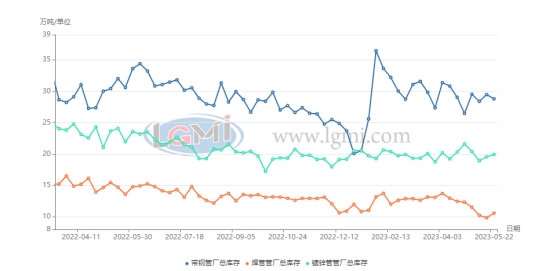 本周,华北地区主流管厂最新统计:截5月25日,华北主流管厂本周总库存59.32万吨,比上周同期增0.41万吨,比上月同期降1.1万吨,比去年同期降6.83万吨,其中:带钢库存28.8万吨,比上周同期降0.67万吨,比上月同期增2.33万吨,比去年同期降1.79万吨;焊管库存10.59万吨,较上周同期增0.72万吨,比上月同期降1.75万吨,比去年同期降3万吨;镀锌管库存19.93万吨,比上周同期增0.36万吨,比上月同期降1.68万吨,比去年同期降2.04万吨;日均成交量2.87万吨,比上周减0.23万吨,比上月同期减0.4万吨,比去年同期增0.18万吨。
