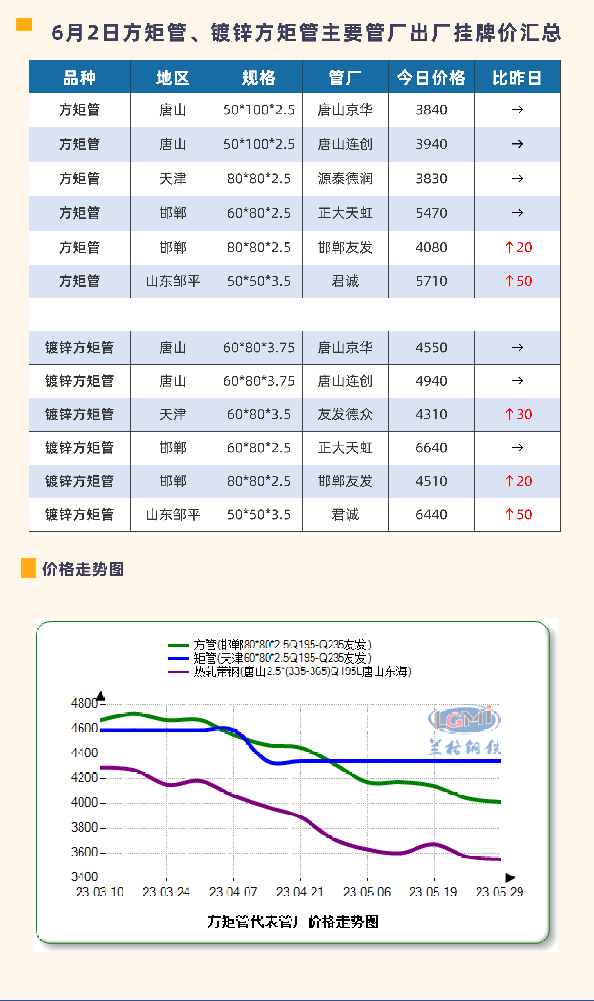 • 6月2日方矩管、镀锌方矩管主要管厂出厂挂牌价汇总